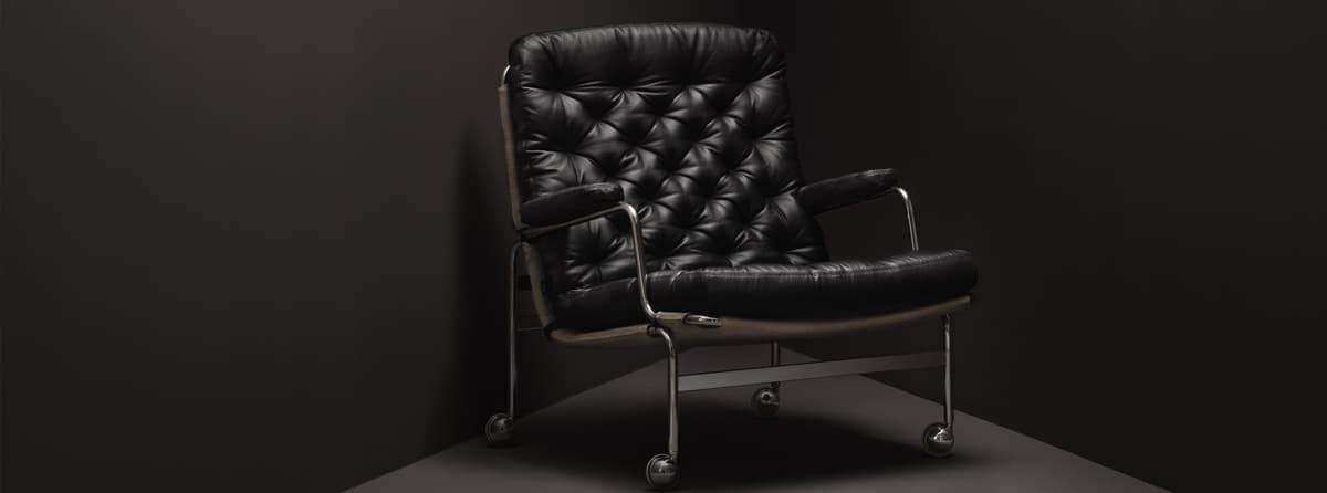 Iconic easy chair designed by Bruno Mathsson. The Jetson chair reflects both his obsession with comfort and a classic Swedish modern design approach. It features a bowl-shaped seat, ergonomically designed high back with head pillow. Chrome swivel base with a unique self-return mechanism.