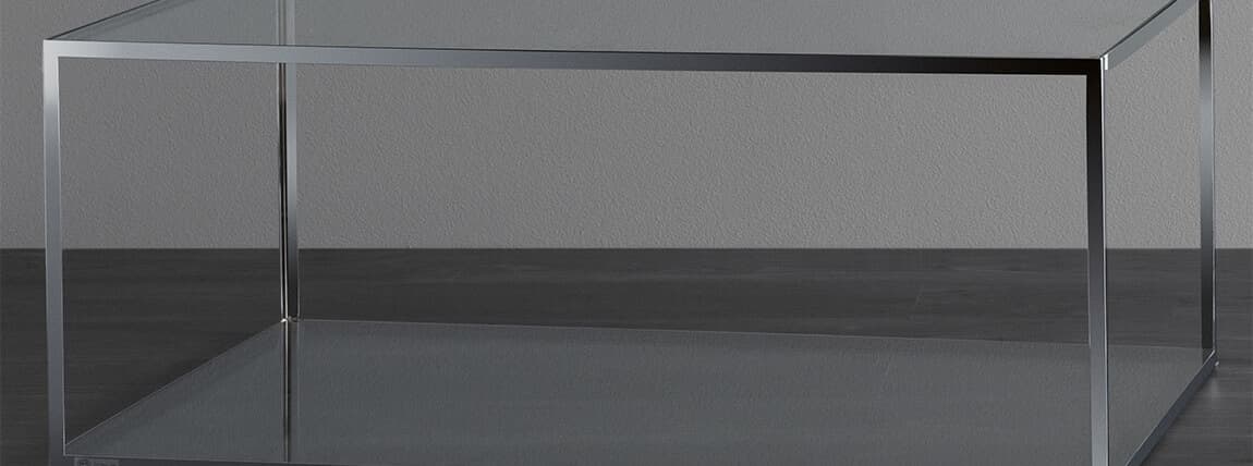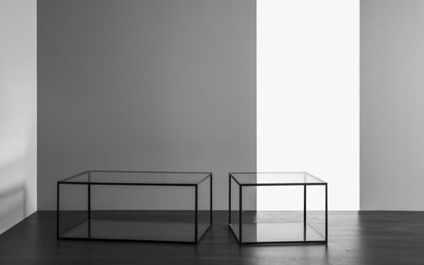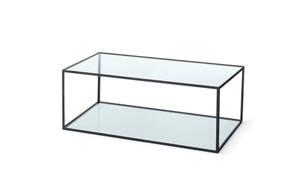 A classic table with a rectangular shape in chrome or black metal, with a glass top and bottom.