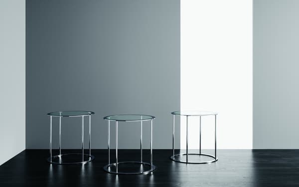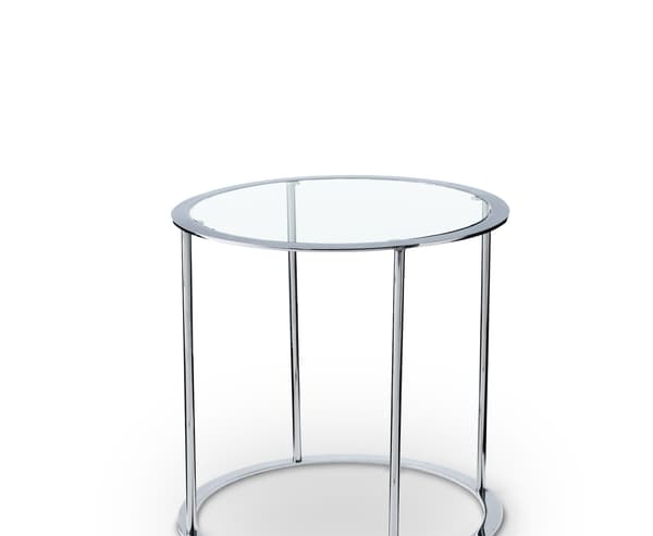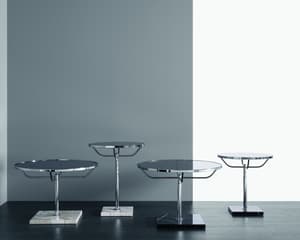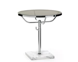 A classic round table in chrome, with manual height adjustment and a marble base.