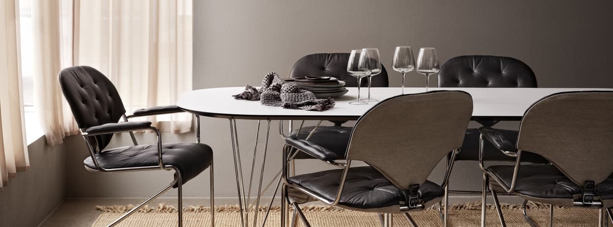 A classic dining table that can be extended. For 6-8 people, elegant top and slim legs.