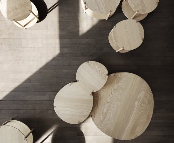 Made in natural ash with wax oil, Lunarias personality comes from its use of soft and warm wood. Its subtle, irregularly rounded table top is reminiscent of how the moon can appear distorted due to the refraction of light by the earth’s atmosphere.