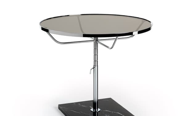 A classic round table in chrome, with a larger top diameter than its smaller counterpart. Featuring manual height adjustment and a marble base.